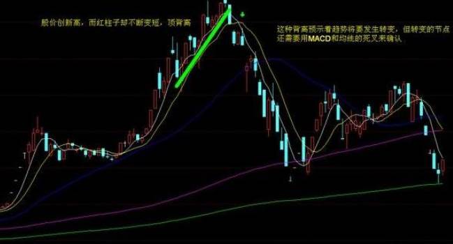 股价创新高,而红柱子却不断变短,顶背离;股价创新低,而绿柱子却不断缩短,底背离。这种背离情况下,说明趋势即将发生转变,但趋势转变的最终形成,还需要用MACD和均线的金叉或死叉来确认。