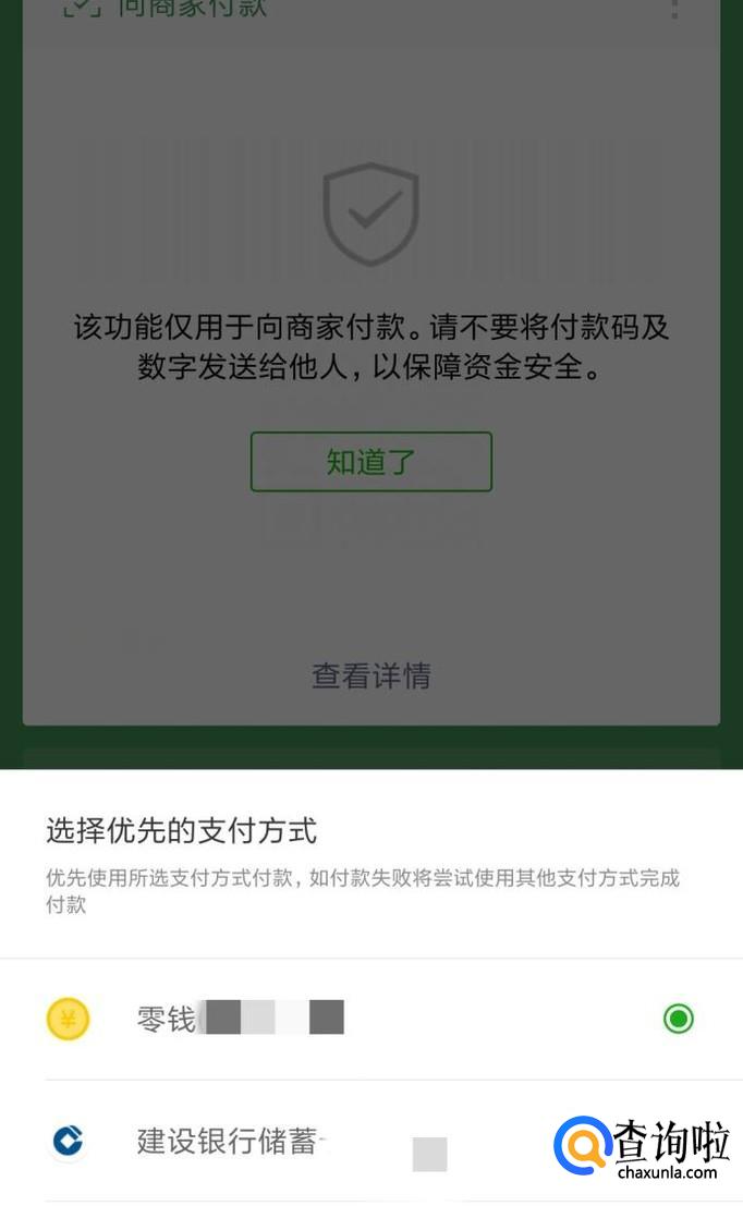 点击二维码下的“零钱”,选择优先支付方式,确定支付银行卡即可