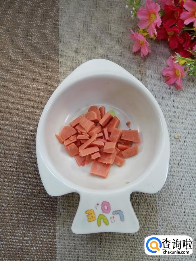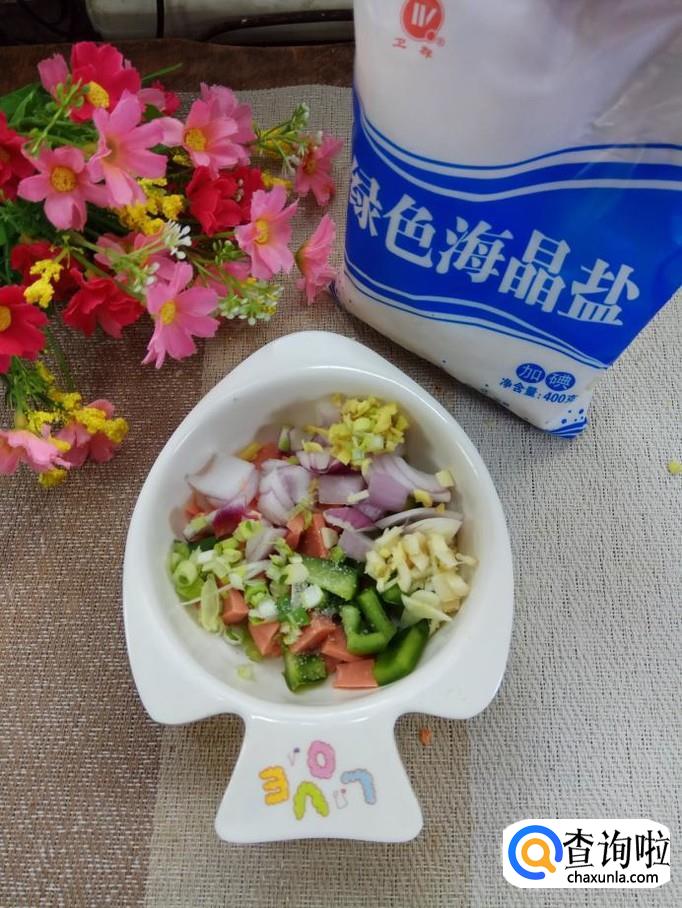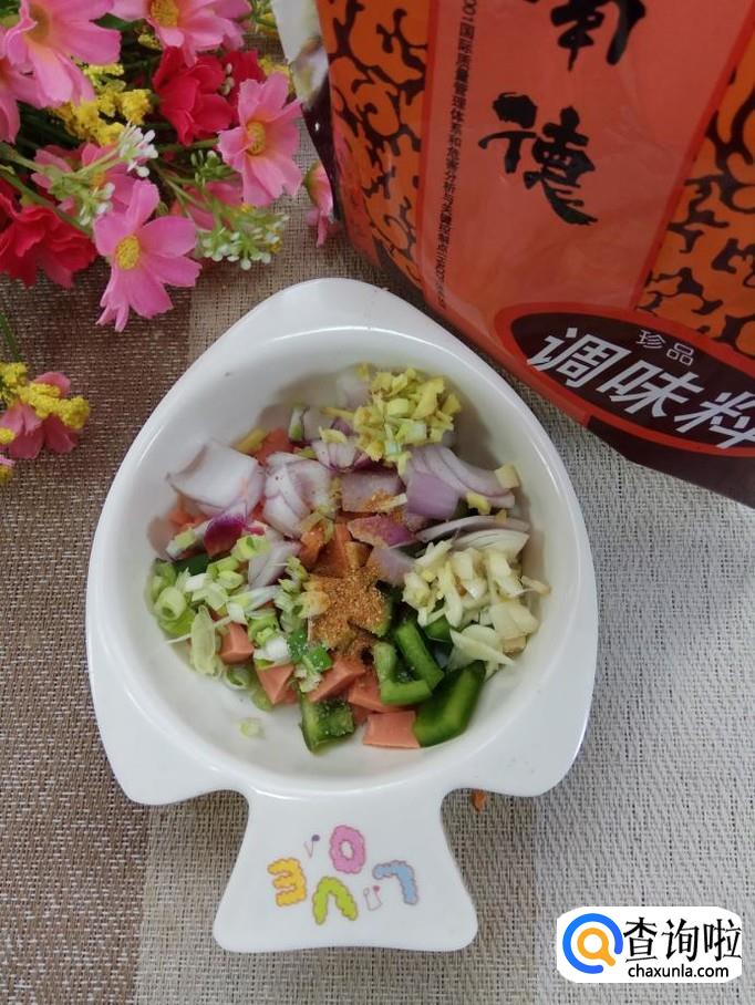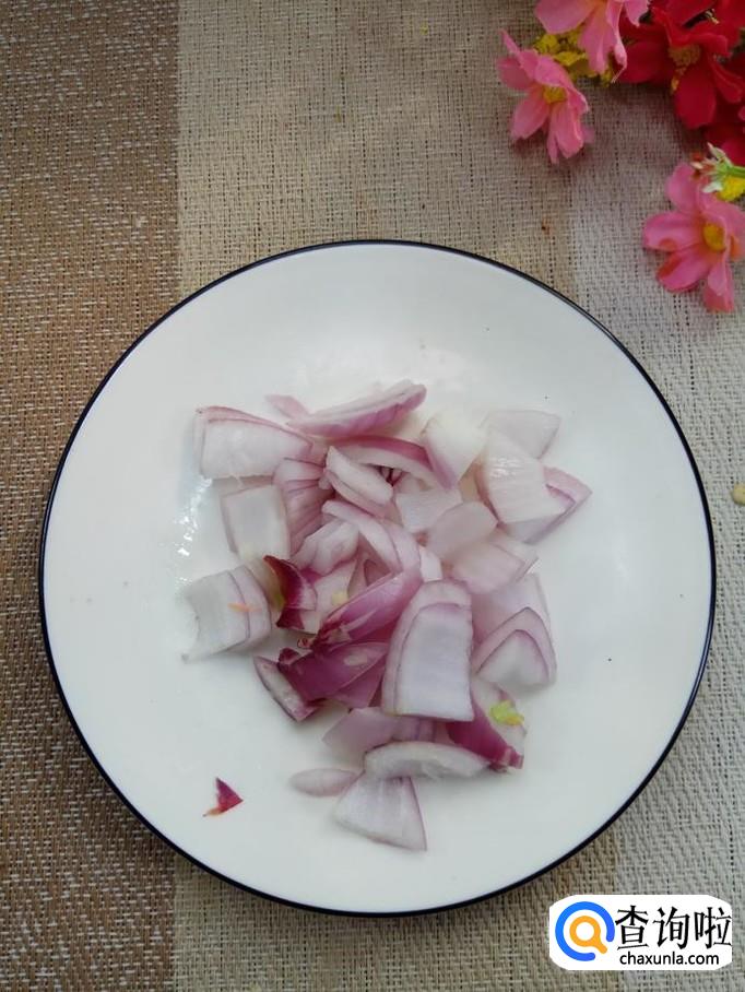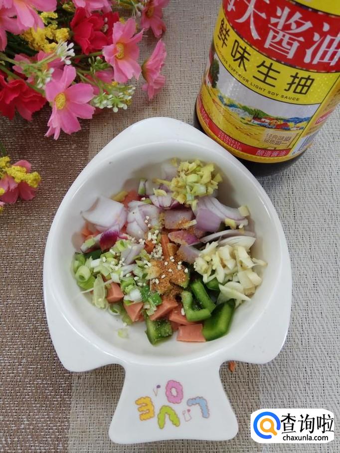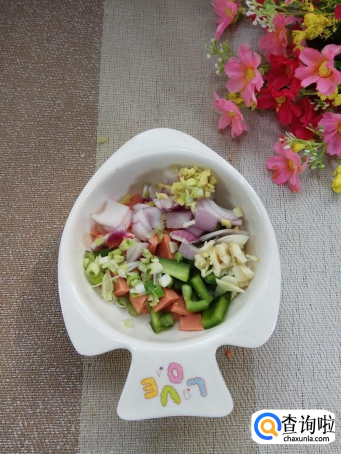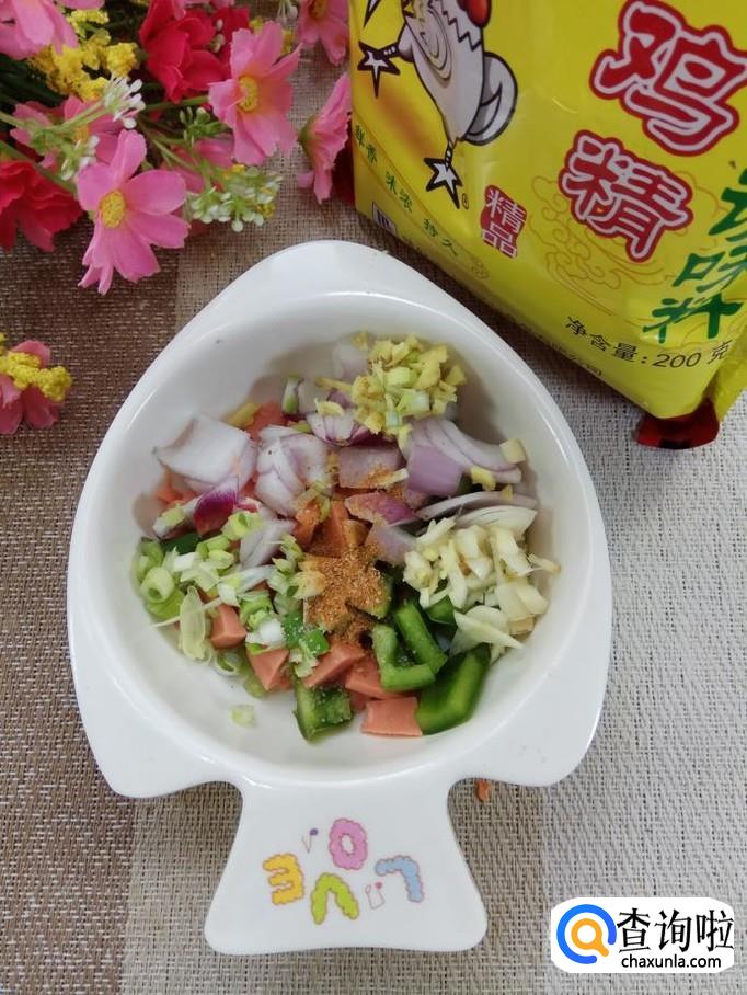 将洋葱切成小丁儿;红椒切成小丁儿;火腿肠去外衣后,切丁儿备用。注意,不要切得太碎。