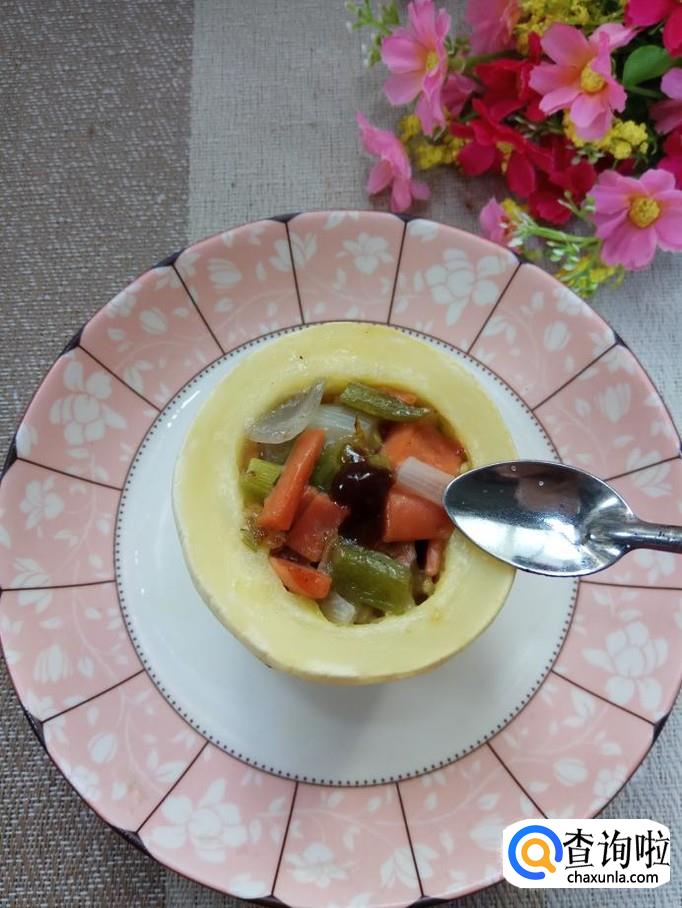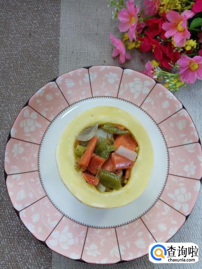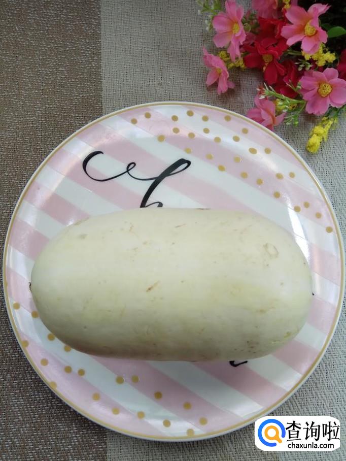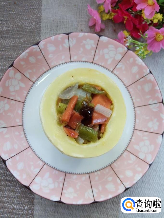 准备一个笋瓜,这是一个白皮笋瓜,将笋瓜切开,分成两半,去除内瓤,在切口处切出花形,做这个步骤的时候一定要有耐心哦。