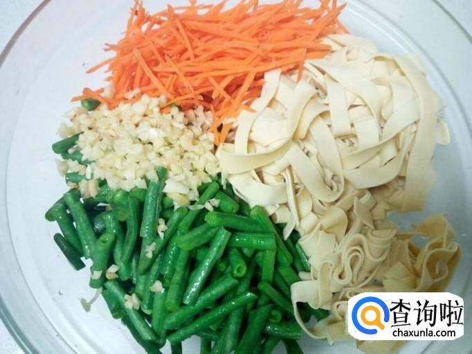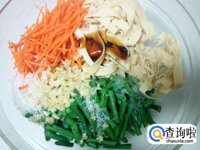 把沥干水的豇豆,干豆腐丝,切好的胡萝卜丝,蒜末,一起放入碗中。放入盐,味精,少许白糖,蚝油,拌和均匀。