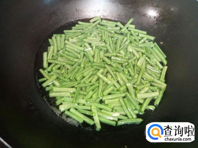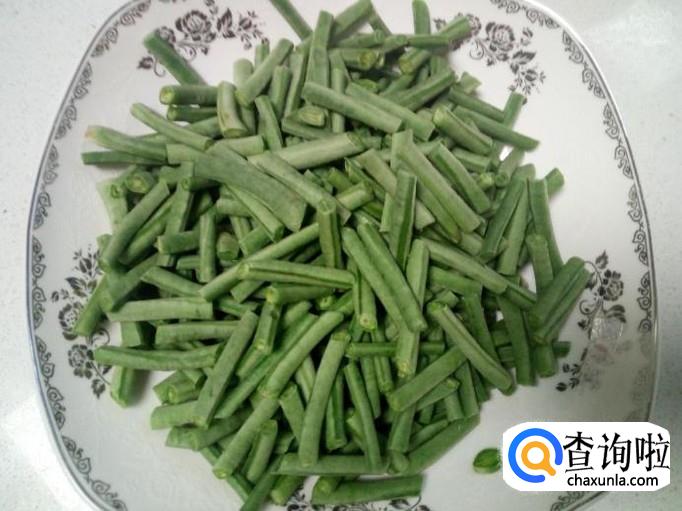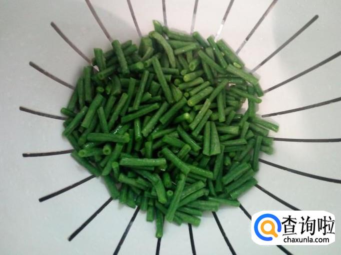 豇豆收拾清洗干净,控干水分,切成寸段。
