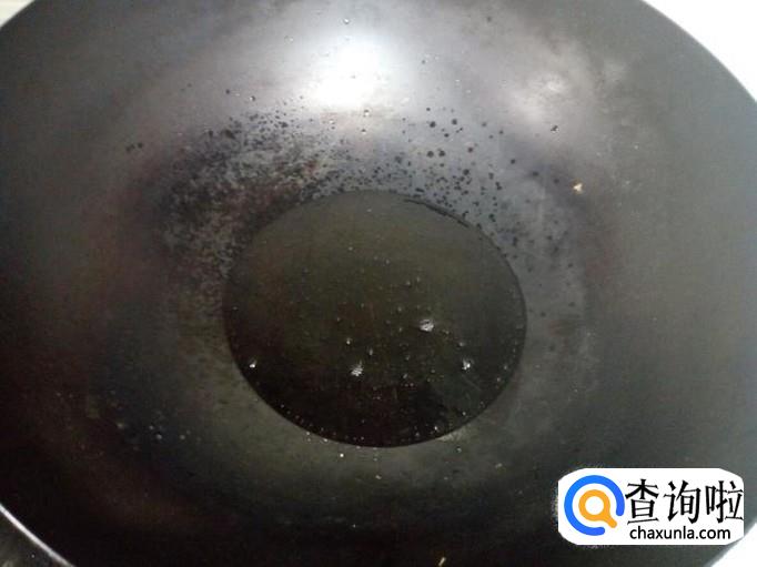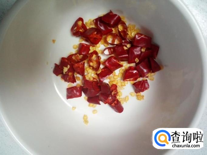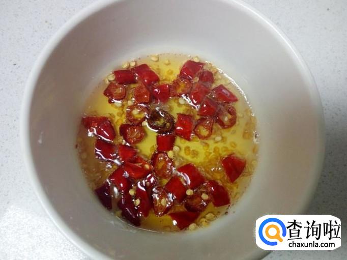 锅内放入油加热,油七,八成热时关火。稍凉后,倒入切好的红干椒碗中,炸成辣椒油。