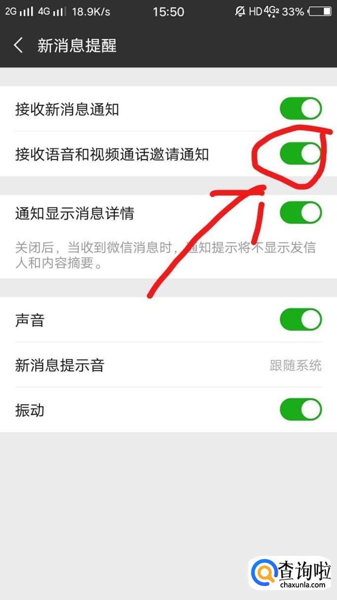 根据自己的情况,关闭微信视频聊天的提示音即可,在这里也可以关闭其他消息类通知的提示音,如图所示。