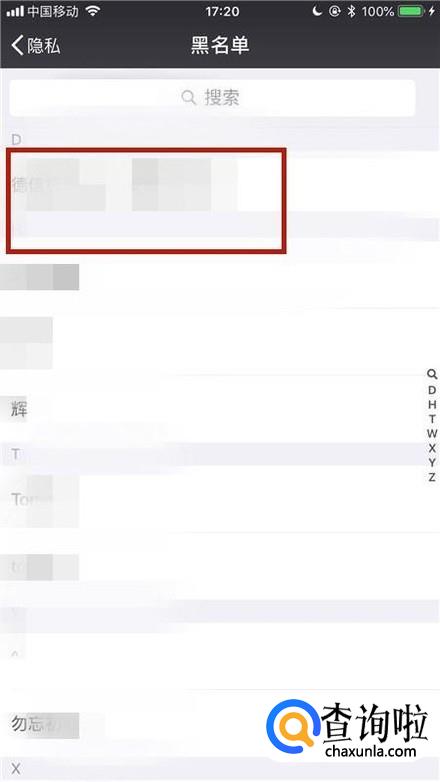 然后在这个界面我们就可以查看到有哪些好友被我们拉黑了。如果你想要恢复某个好友只要点击这个好友,如下图所示。