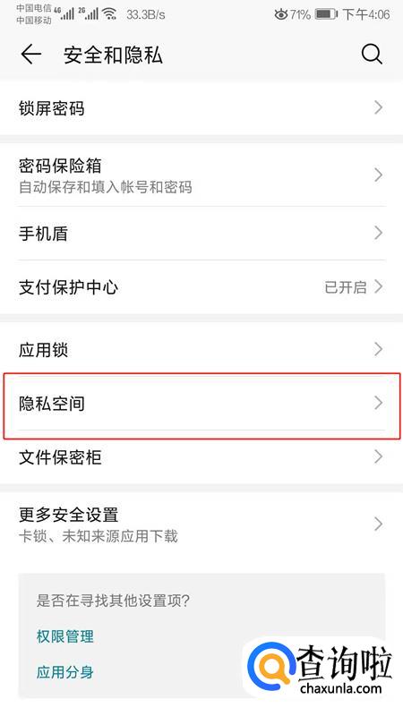 打开安全与隐私,找到隐私空间。