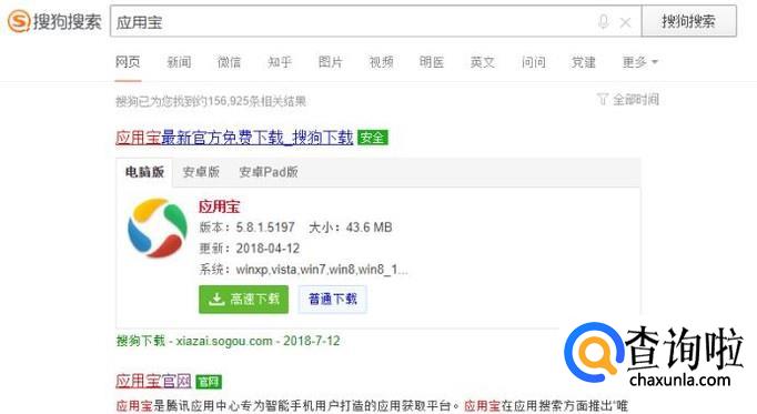 打开搜狗搜索,搜索应用宝,将其安装到电脑上面,如图所示。