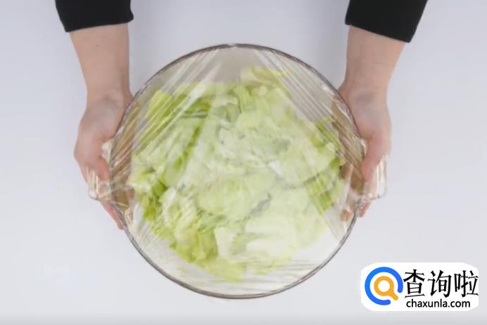 用保鲜膜封住碗口,然后均匀摇晃,这样菜叶会更加入味,而且会变得更软。