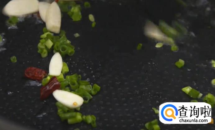 然后,继续往锅里加入葱花、辣椒碎和蒜片,煸炒直至爆香。