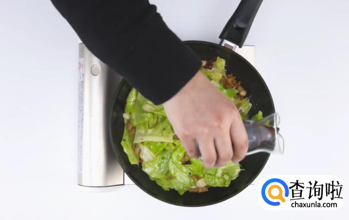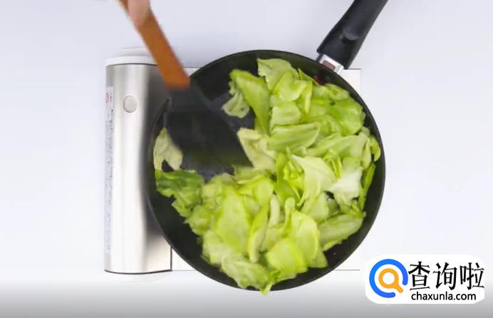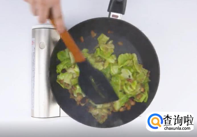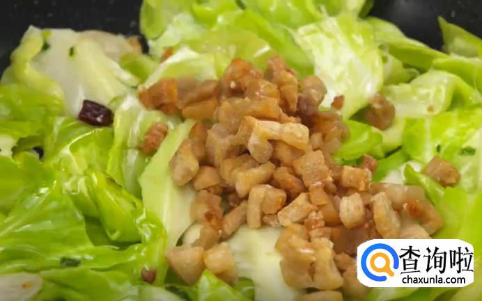 爆香后,加入包菜快炒3分钟,然后再将刚才捞出的油渣倒进去。