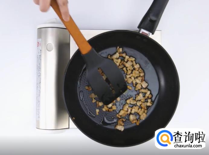 接下来,在锅里热好油,将准备好的猪油渣倒进去煸炒,直至出油,然后捞出猪油渣。