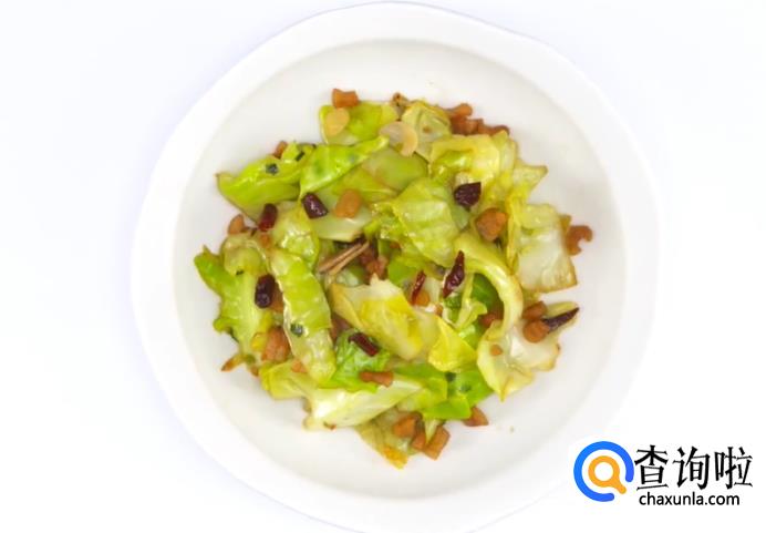 炒好后,将包菜和油渣一起装盘,即可食用。