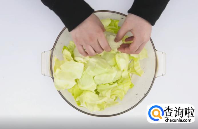将包菜洗干净,然后撕成大小适中的叶片,然后装进大碗里。