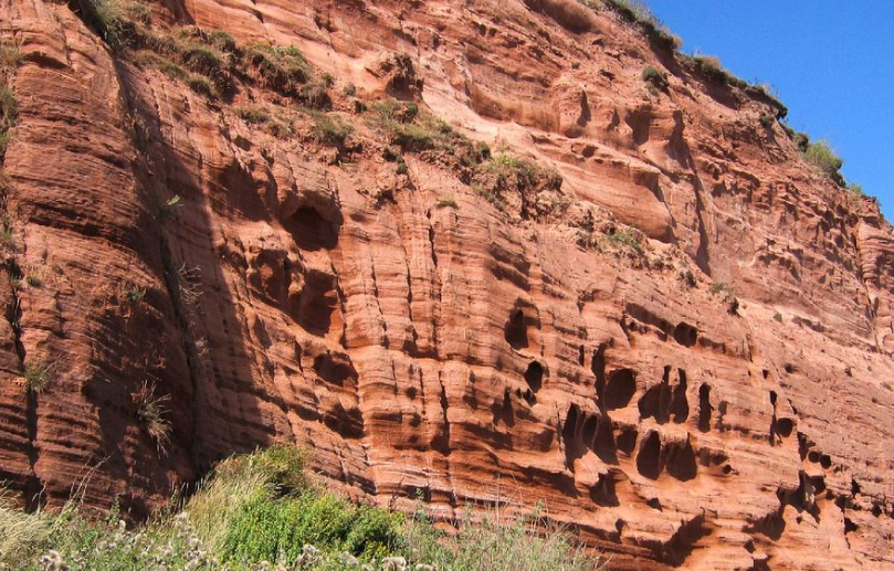沉积岩的颜色主要受到沉积环境影响,且较直观易辨认,是观察和研究沉积岩的重要内容之一。暗色矿物和岩层含量多的沉积岩颜色较深;反之,浅色矿物含量多的沉积岩颜色较浅。含有铁的沉积岩呈红色或褐色,含有钙与硅的沉积岩呈白、灰色。