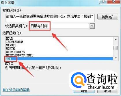 点击其他函数选项在弹出的对话框内找到选择类别里的日期与时间,然后在选择函数里找到now函数,如图所示: