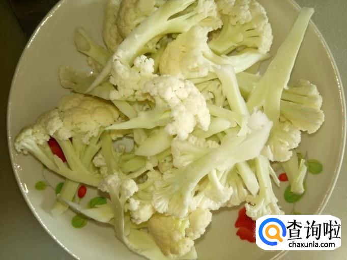 将花菜切成一小朵一小朵的,放入盆里,加水浸泡半小时,再清洗干净,沥干水分;