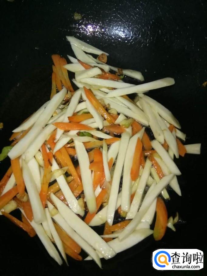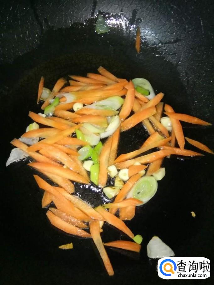 将胡萝卜下入锅里,翻炒至熟(胡萝卜变软,颜色变浅);胡萝卜一定要炒熟透了,营养才能被人体吸收;