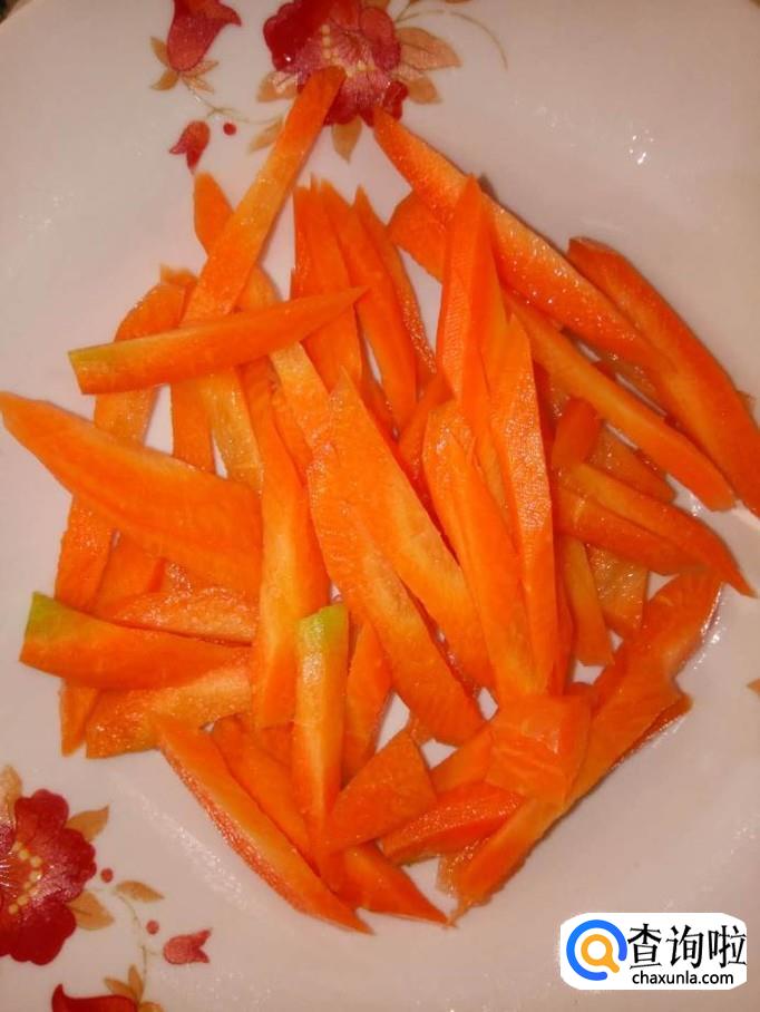 取半根胡萝卜,将胡萝卜去皮,洗净,切成细条状;