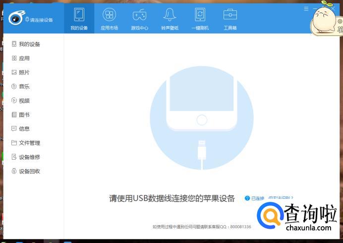 点击进入后,我们可以看到它的主界面提示请连接你的苹果设备。