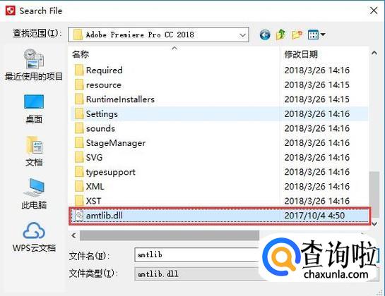 在弹出的对话框中去查找需要破解文件,默认路径在C:Program FilesAdobeAdobe Premiere Pro CC 2018。然后选择amblit文件点击打开即可。