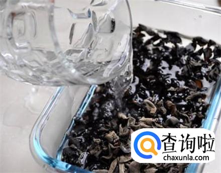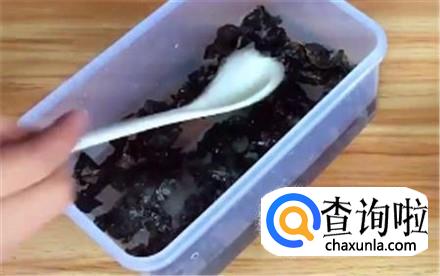 将快餐盒或者是盆子里加上适当清水,清水的多少视木耳多少而决定。