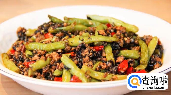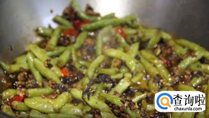 肉变色之后,加入蒜末继续翻炒,然后放入橄榄菜,翻炒均匀后下干辣椒,最后将四季豆放进去一起翻炒。