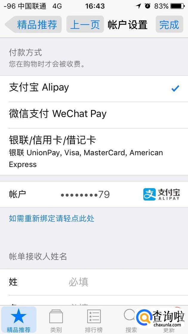 在精品推荐页面的最下面我们可以选择不同的支付方式,这里以支付宝为例,点击绑定支付宝。