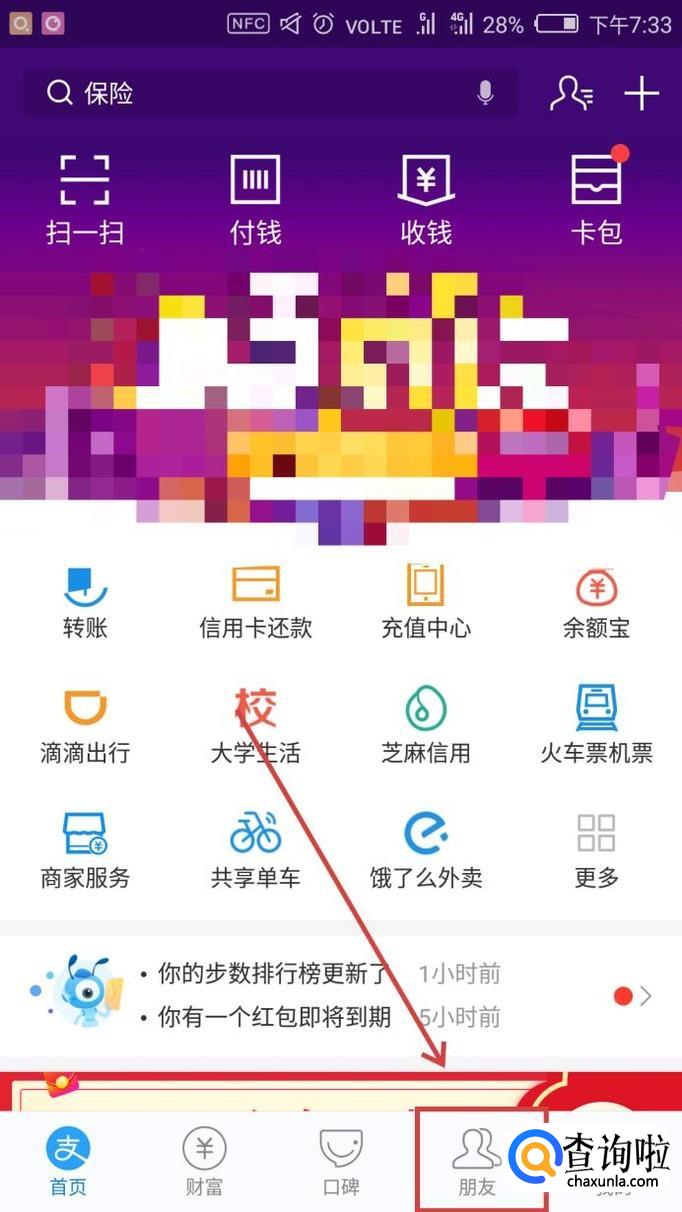 打开支付宝,在界面下面的菜单栏里找到【朋友】,点击进入。