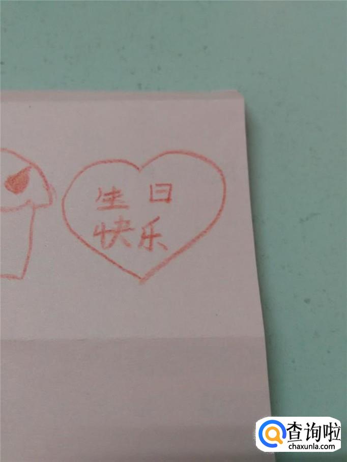 用红笔在桃心上写生日快乐四个字。