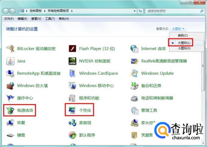 控制面板查看方式选择大图标,在左下方可以看到我们需要的“电源选项”和“个性化”,分别用于设置休眠和屏保;