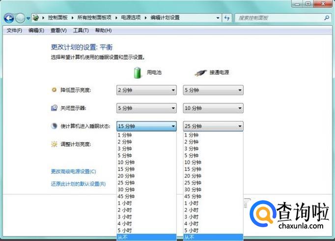 这里可以分别设置用电池和用电源时系统进入休眠的时间,都选择“从不”,降低显示器亮度和关闭显示器的时间,也可以在这里设置;