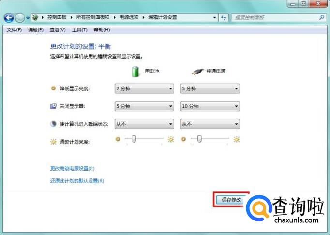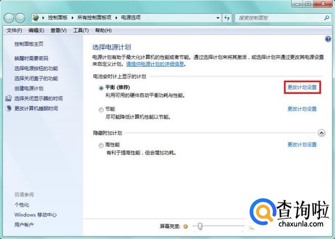 电源选项可以从控制面板进入,也可以从上一步左下角的“更改电源设置”进入,然后点击常用电源计划的“更改计划设置”;