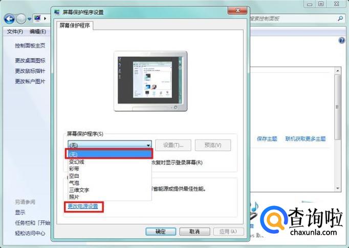 进入以后,点击下拉选,选择屏幕保护程序为“(无)”,应用确认即可,这样屏保就被关闭了;