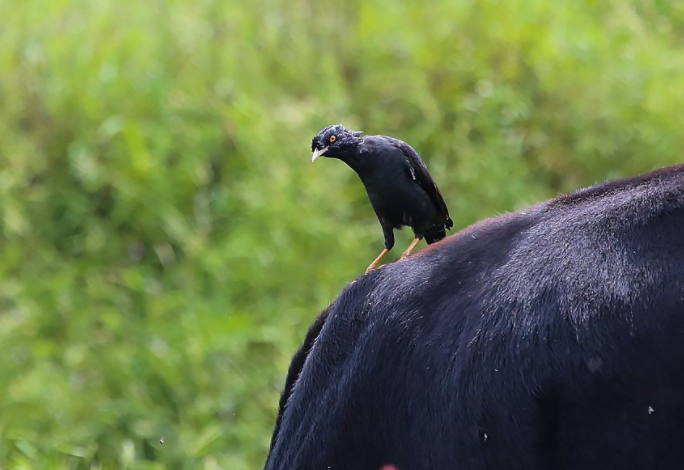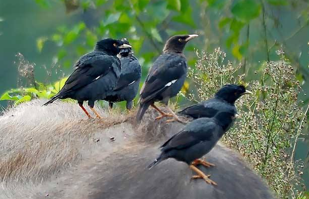 这种合作关系,在自然界较为普遍。除了八哥外,椋鸟科的丝光椋鸟、白领八哥等,以及鹭科的牛背鹭,也喜欢呆在水牛周围或站在牛背上取食。这些鸟类帮助控制了田地里的昆虫数量,也受到了农民的欢迎。