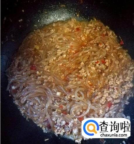 然后加入少许清水,再把泡软的粉丝倒入锅中,翻炒均匀,一碟美味的蚂蚁上树就做好了。