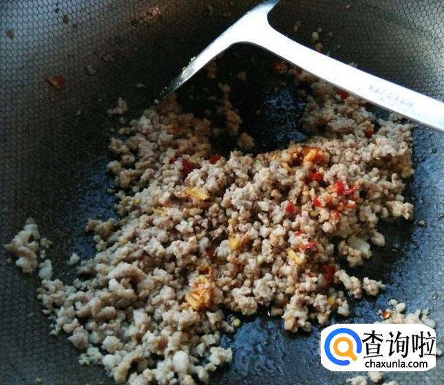 热锅下油,放入姜蒜葱煸香,然后倒入肉沫,把肉沫翻炒至熟。
