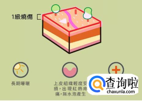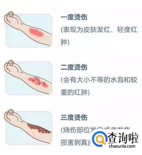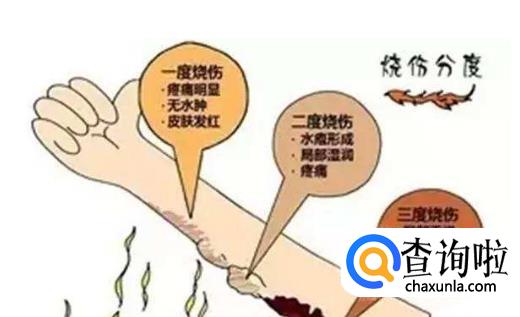 一度烧烫伤为皮肤起红斑,无水泡,不破皮,有灼痛感。二度烫伤起水泡,掉皮,红肿,二度烫伤分为浅二度和深二度。三度烫伤,有焦痂,如牛皮状,皮革样。
