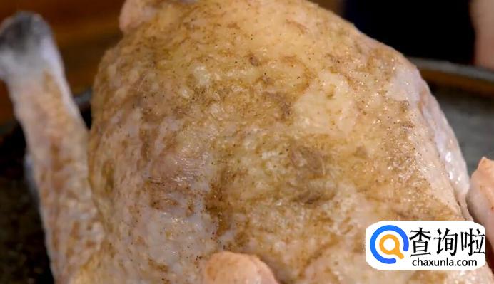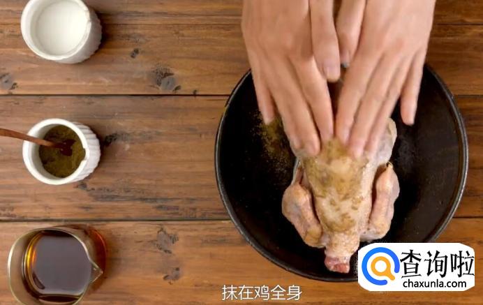 首先将土鸡洗干净,将盐、花椒粉和料酒抹在鸡全身。