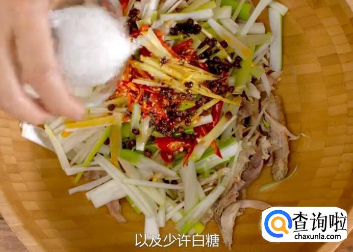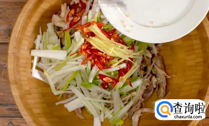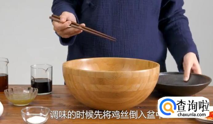 将鸡丝倒入盆中。