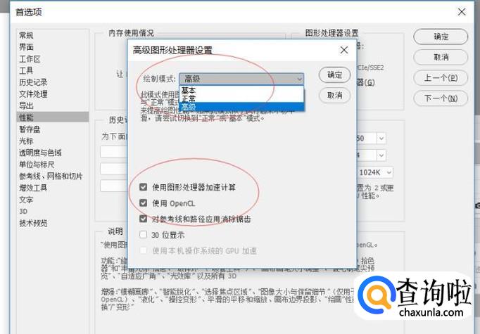 点击高级设置,弹出设置信息,调整绘制模式,选择正常即可,下面的处理模式,鼠标悬停时对应的会有对应的建议,可以选择性的取消掉