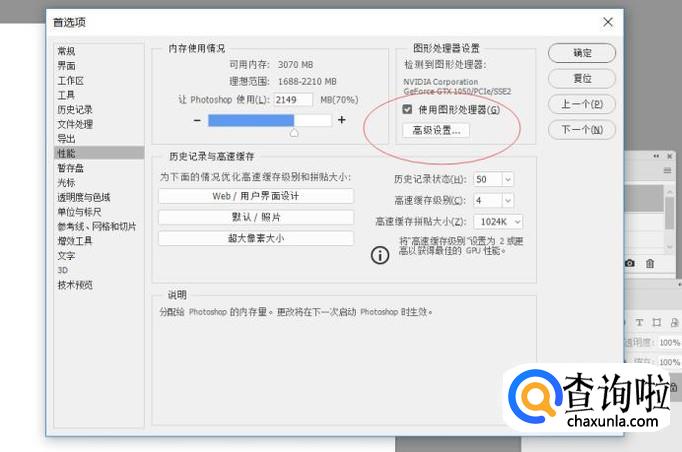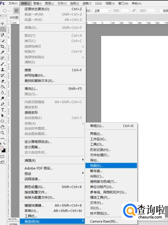 打开Photoshop,选择工具栏中 编辑>首选项>性能,如下图