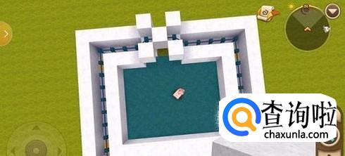 然后,将四个角上的其中一块硬沙块换成发射器,里面全部放好水,如图所示,不要忘了给自己做一个进入游泳池的门哦。