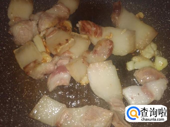 然后把肥点的肉片先进去煎出油。