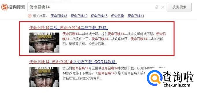 首先,我们使用搜索引擎搜索“使命召唤14”关键字,在搜索结果页面中,点击进入游戏网站。