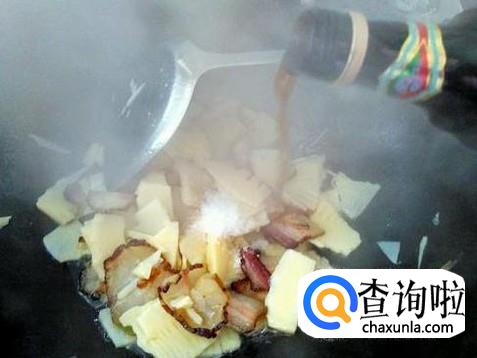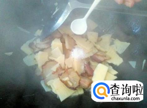 然后放笋片进去,加适量的盐翻炒一下。