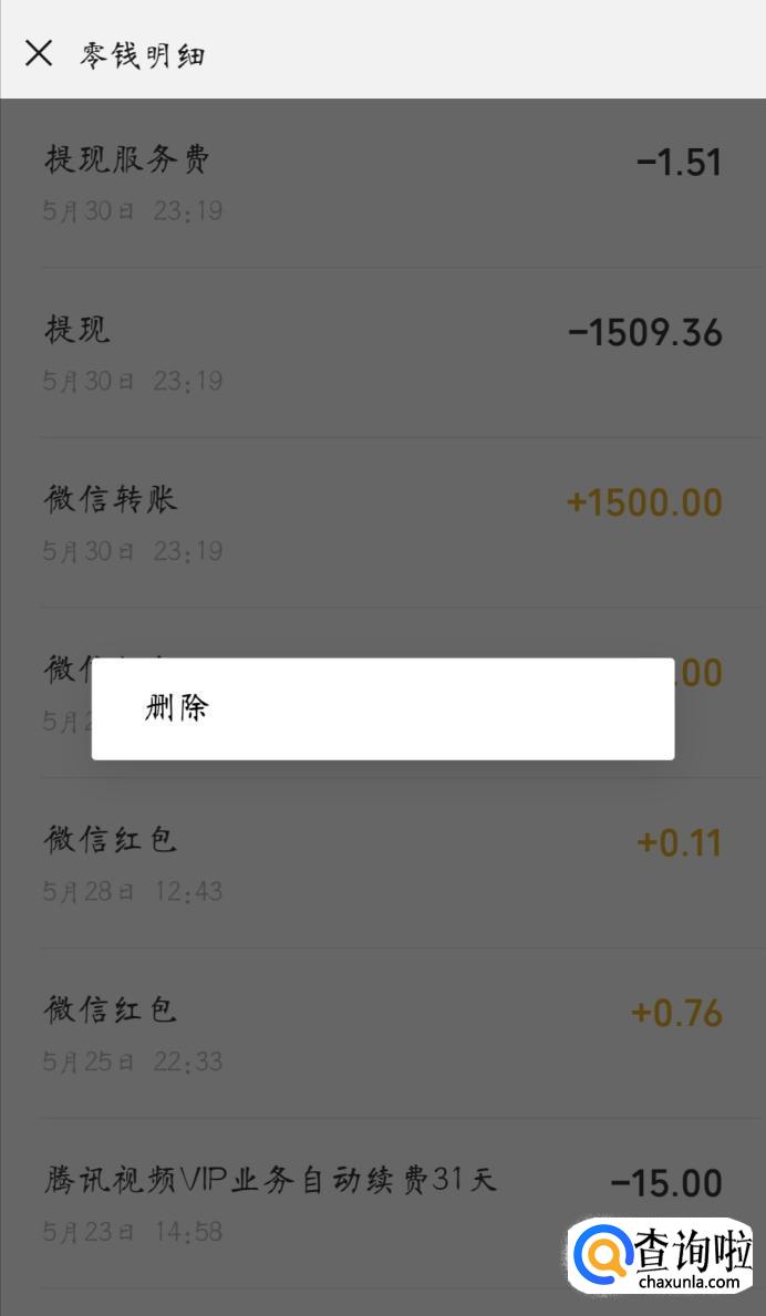 选择一条要删除的零钱明细,长按至出现“删除”的字样,点击删除