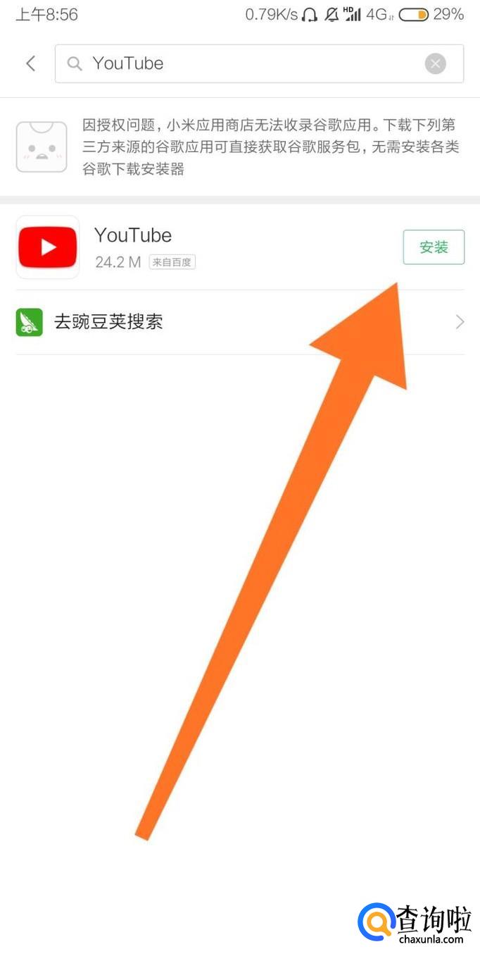 进入“应用商店”后,在搜索栏输入任意一款谷歌应用名称,在这里我们输入“YouTube”,然后点击搜索图标。