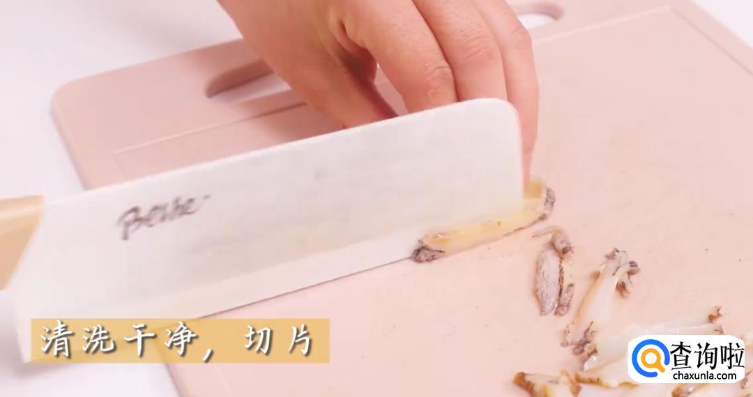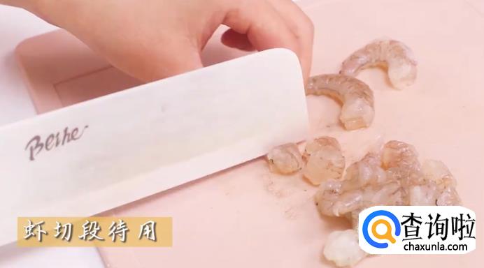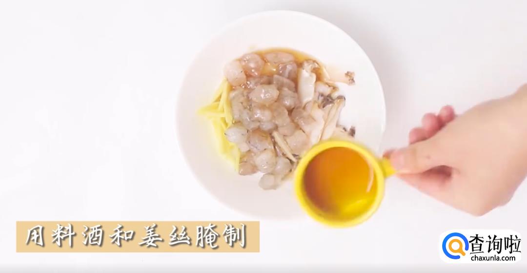 用料酒和姜丝腌制虾段和鲍鱼片。