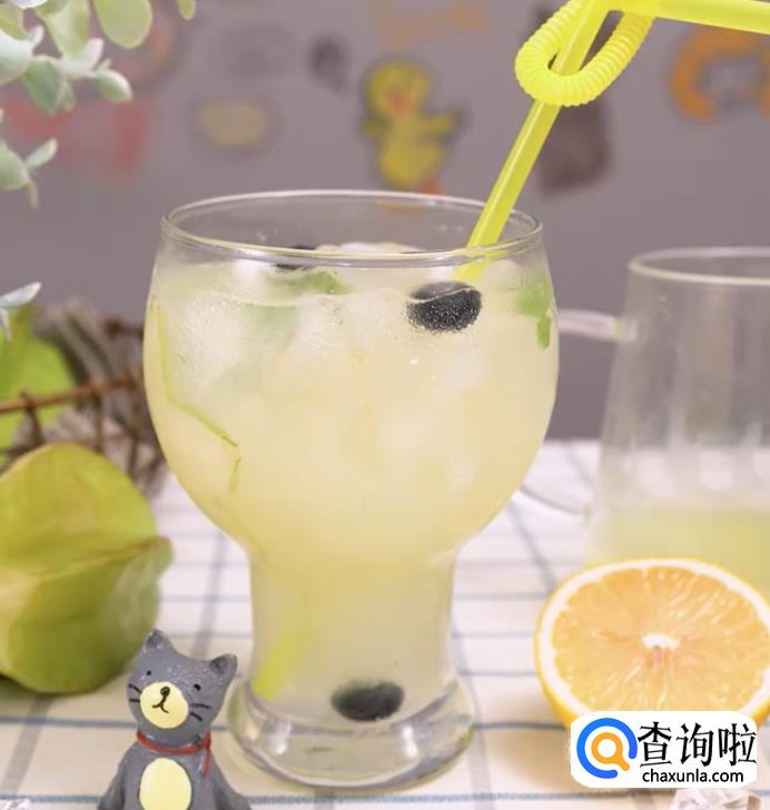 杨桃、柠檬、蓝莓、雪碧、青苹果、冰块、薄荷叶