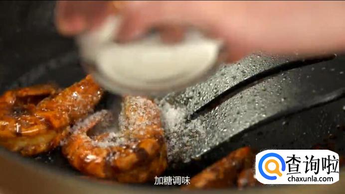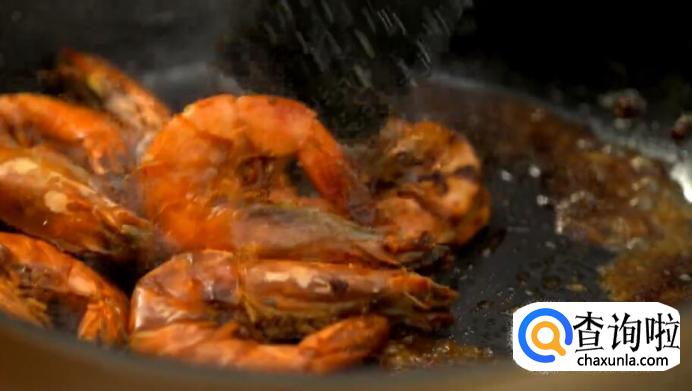 把姜蓉倒入余下的热油中爆香,再依次加入料酒、豉油、老抽,炒匀后加入大虾继续翻炒。